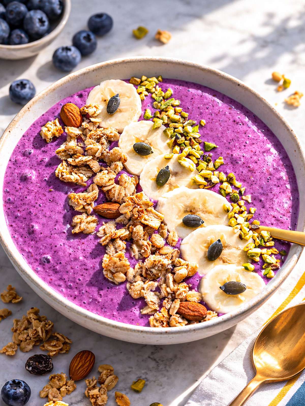 - Freeze Fruit: Use frozen blueberries and bananas for a thick scoopable smoothie bowl.