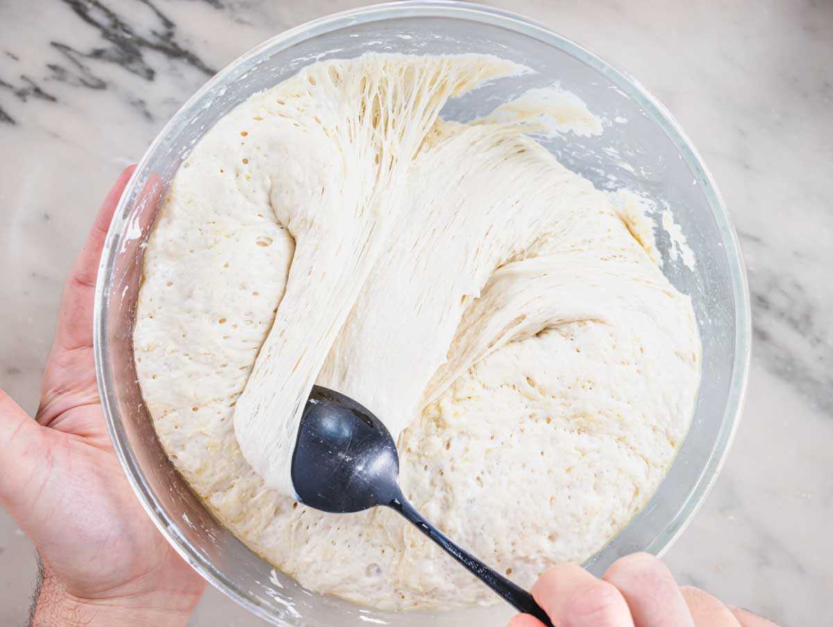 - MAKE THE DOUGH: To a large mixing bowl, add and stir flour and salt. Now add the yeast-water mixture and stir with a sturdy wooden spoon until you have a wet, sticky dough (about 1 minute).Add extra virgin olive oil and stir one more minute until incorporated.