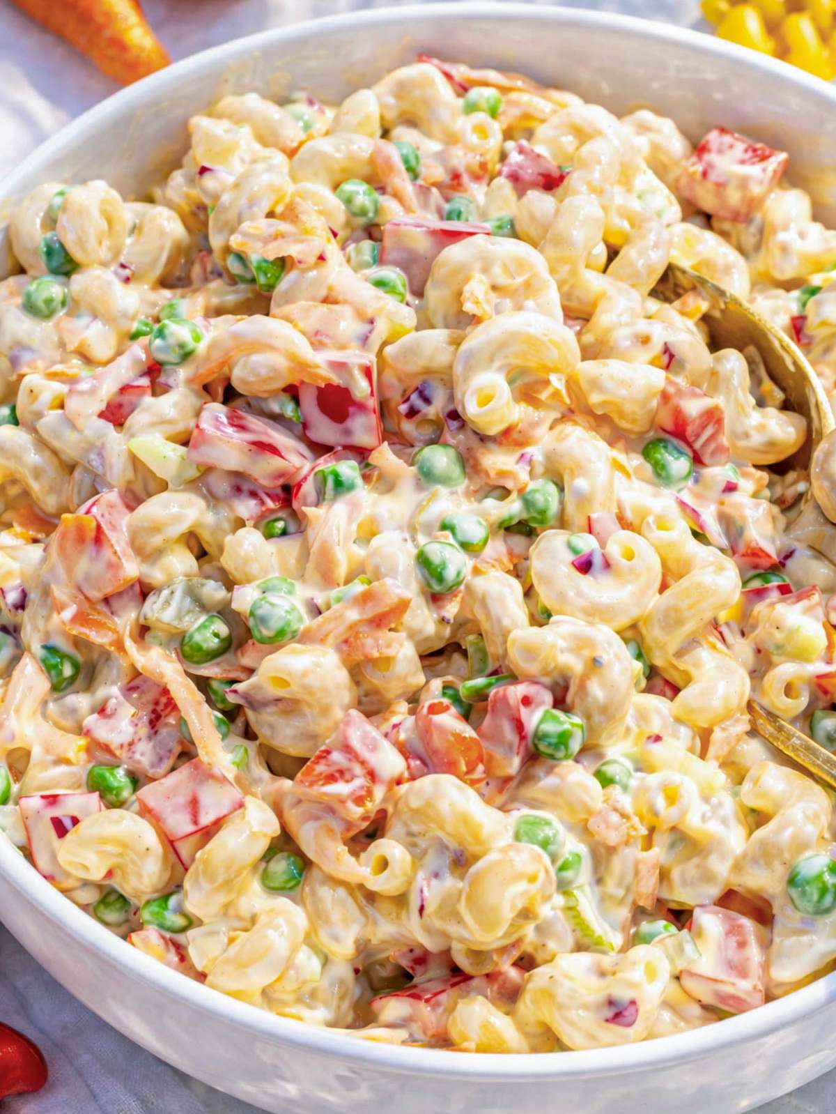 Add the cooled pasta and peas to a large bowl with the carrot, bell pepper, onion, celery, and pickles. Pour the dressing on top and stir gently until everything is evenly coated. Serve right away, or cover and refrigerate for a make ahead macaroni salad that tastes even better after chilling.