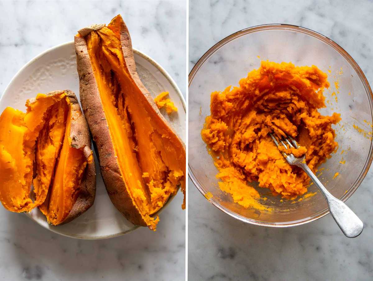 Step 1: Prick the sweet potatoes with a fork and microwave them for 7 to 10 minutes until tender. Cut them in half, scoop out the flesh, add it to a bowl, and mash with a fork.