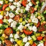 Marinate the beans: Drain and rinse 1 can chickpeas and 1 can black beans add them to the dressing and toss well. Let them sit while you chop the veggies so they absorb the flavor and lose the canned taste.