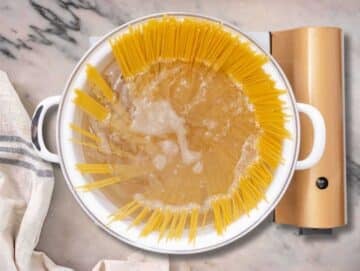 Cook the Pasta: Boil ¾ gallon water in a large pot, add 1½ tablespoons salt, and 12 ounces spaghetti.Cook until just before al dente (about a minute early), stirring once or twice. Before draining, save a cup of that starchy pasta water.